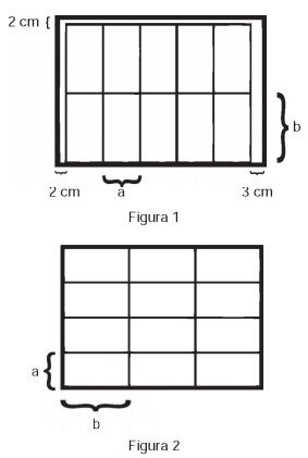 Em uma das paredes de um depósito existem compartimentos de mesmo tamanho para armazenamento de caixas de dimensões frontais a e b. A terceira dimensão da caixa coincide com a profundidade de cada um dos compartimentos. Inicialmente as caixas são arrumadas, em cada um deles, como representado na Figura 1. A fim de aproveitar melhor o espaço, uma nova proposta de disposição das caixas foi idealizada e está indicada na Figura 2. Essa nova proposta possibilitaria o aumento do número de caixas armazenadas de 10 para 12 e a eliminação de folgas.