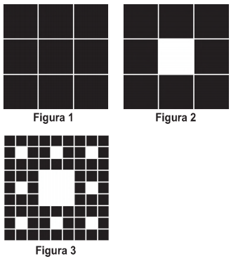 Admita que esse processo seja executado 3 vezes, ou seja, divide-se cada um dos quadrados pretos da Figura 3 em 9 quadrados idênticos e remove-se o quadrado central de cada um deles.