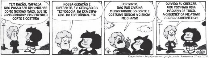 No processo de modernização apresentado na tirinha, Mafalda depara-se com um contraponto entre