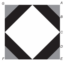 A logomarca de uma empresa de computação é um quadrado, AEFG, com partes pintadas como mostra a figura. Sabe-se que todos os ângulos agudos presentes na figura medem 45° e que AB = BC = CD = DE. A fim de divulgar a marca entre os empregados, a gerência decidiu que fossem pintadas logomarcas de diversos tamanhos nas portas, paredes e fachada da empresa. Pintadas as partes cinza de todas as logomarcas, sem desperdício e sem sobras, já foram gastos R$ 320,00.