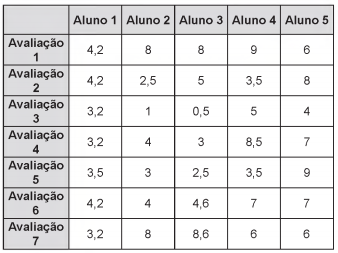 Uma escola da periferia de São Paulo está com um projeto em parceria com as universidades públicas. Nesse projeto piloto, cada turma encaminhará um aluno que esteja apresentando dificuldades de aprendizagem para um acompanhamento especializado. Para isso, em cada turma, foram aplicadas 7 avaliações diagnosticas. Os resultados obtidos em determinada turma foram os seguintes: