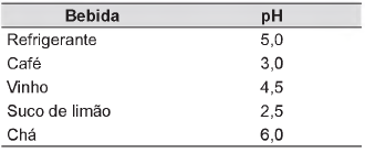 A tabela lista os valores de pH de algumas bebidas consumidas pela população.