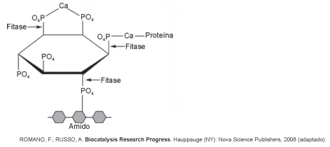 O fitato, presente em diversos cereais, apresenta a propriedade de associar-se a alguns minerais, proteínas e carboidratos, formando complexos insolúveis e incapazes de serem digeridos por animais monogástricos. Por esse motivo, muitas rações ricas em cereais contêm, na sua formulação final, a enzima fitase como aditivo. O esquema de ação dessa enzima sobre o fitato está representado na figura.