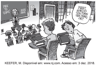 No cartum, o estudante faz uma pergunta usando turn this thing on por