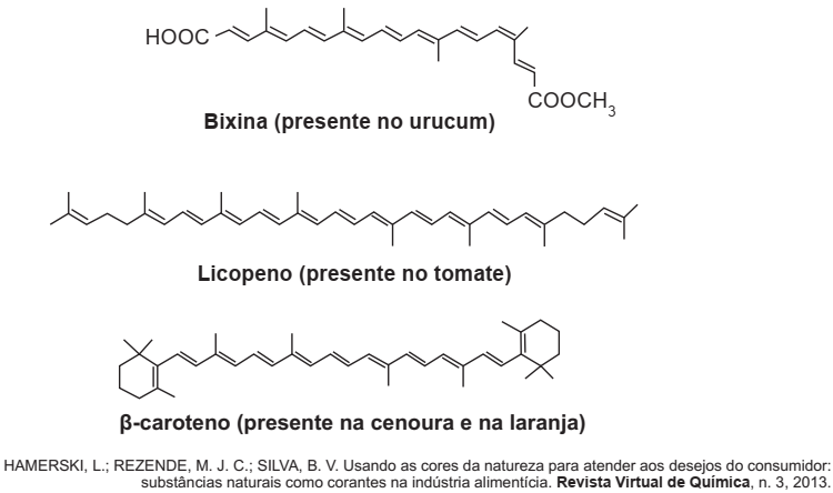 A utilização de corantes na indústria de alimentos é bastante difundida e a escolha por corantes naturais vem sendo mais explorada por diversas razões. A seguir são mostradas três estruturas de corantes naturais.
