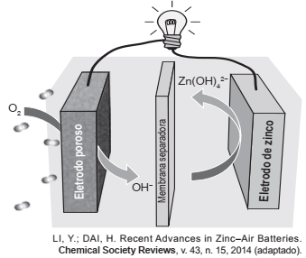 Grupos de pesquisa em todo o mundo vêm buscando soluções inovadoras, visando a produção de dispositivos para a geração de energia elétrica. Dentre eles, pode-se destacar as baterias de zinco-ar, que combinam o oxigênio atmosférico e o metal zinco em um eletrólito aquoso de caráter alcalino. O esquema de funcionamento da bateria zinco-ar está apresentado na figura.