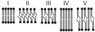 Assim, existem bicamadas lipídicas com diferentes composições de fosfolipídios, como as mostradas de I a V.
