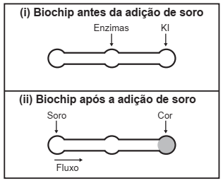Estudos mostram o desenvolvimento de biochips utilizados para auxiliar o diagnóstico de diabetes melito, doença evidenciada pelo excesso de glicose no organismo. O teste é simples e consiste em duas reações sequenciais na superfície do biochip, entre a amostra de soro sanguíneo do paciente, enzimas específicas e reagente (iodeto de potássio, KI), conforme mostrado na imagem.