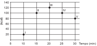 Os exercícios físicos são recomendados para o bom funcionamento do organismo, pois aceleram o metabolismo e, em consequência, elevam o consumo de calorias. No gráfico, estão registrados os valores calóricos, em kcal, gastos em cinco diferentes atividades físicas, em função do tempo dedicado às atividades, contado em minuto.