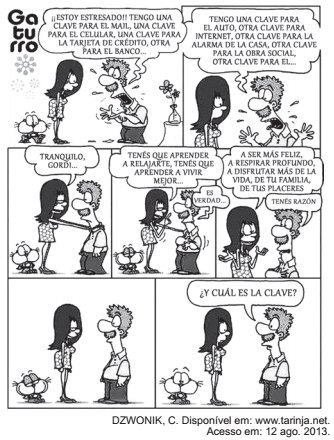 A palavra clave, repetida diversas vezes na tirinha de Gaturro, leva o...