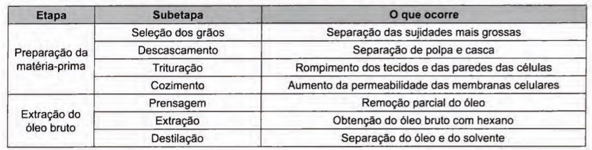 A obtenção de óleos vegetais, de maneira geral, passa pelas etapas descritas no quadro.