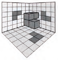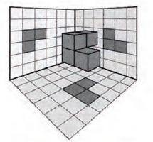 Para facilitar a movimentação do objeto pelo usuário, o programa projeta ortogonalmente esse sólido em três planos quadriculados perpendiculares entre si, durante sua descida.
