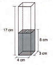 Num recipiente com a forma de paralelepípedo reto-retângulo, colocou-se água até a altura de 8 cm e um objeto, que ficou flutuando na superfície da água.