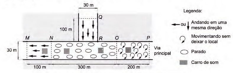 Com essa metodologia, procederam-se aos cálculos para estimar o número de participantes na manifestação cujo esboço geométrico é dado na figura. Há três trechos na via principal: MN, NO e OP, e um trecho numa via afluente da principal: QR .
