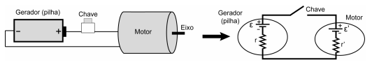 Diversos brinquedos são constituídos de pilhas ligadas a um motor elétrico. A figura mostra uma pilha e um motor acoplados, em que ε representa a força eletromotriz (FEM) da pilha, ε’ representa a força contraeletromotriz (FCEM) do motor e r e r’ são resistências internas. Um problema comum que danifica esses brinquedos é o travamento do eixo do motor.