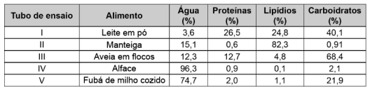 Um pesquisador colocou a mesma quantidade de solução aquosa da enzima digestiva pepsina em cinco tubos de ensaio. Em seguida, adicionou massas iguais dos alimentos descritos no quadro. Os alimentos foram deixados em contato com a solução digestiva durante o mesmo intervalo de tempo.