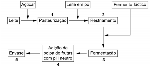 Em uma das etapas do processo de produção de iogurte, esquematizado na figura, ocorre a mudança da consistência característica do leite, de líquido para gel.