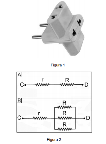 O adaptador de tomada tipo T (Figura 1) é um acessório utilizado em domicílios para ligar vários aparelhos eletrodomésticos em uma única tomada. Conectar três aparelhos de alta potência em um mesmo adaptador pode superaquecê-lo e, consequentemente, provocar um incêndio. O circuito da Figura 2A representa um aparelho de resistência elétrica R ligado ao adaptador de resistência elétrica r. Na Figura 2B está representado um circuito com três aparelhos de resistência elétrica R ligados ao mesmo adaptador. Em ambos os circuitos, os pontos C e D são os terminais de uma mesma tomada elétrica. Considere todos os resistores ôhmicos.