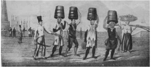A repugnante tarefa de carregar lixo e os dejetos da casa para as praças e praias era geralmente destinada ao único escravo da família ou ao de menor status ou valor. Todas as noites, depois das dez horas, os escravos conhecidos popularmente como “tigres” levavam tubos ou barris de excremento e lixo sobre a cabeça pelas ruas do Rio.
