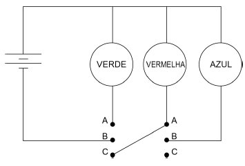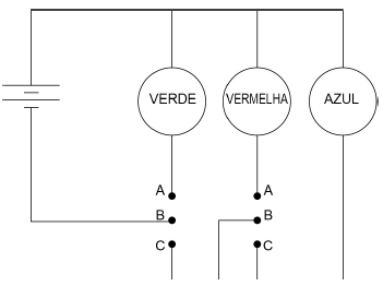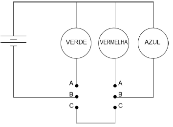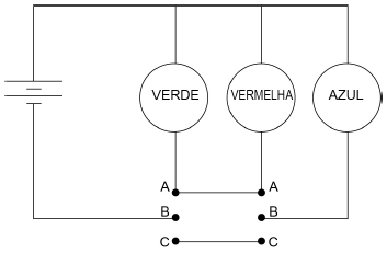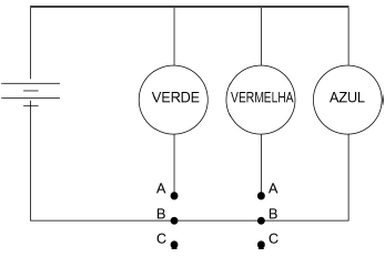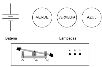 Um garoto precisa montar um circuito que acenda três lâmpadas de cores diferentes, uma de cada vez. Ele dispõe das lâmpadas, de fios, uma bateria e dois interruptores, como ilustrado, junto com seu símbolo de três pontos. Quando esse interruptor fecha AB, abre BC e vice-versa.