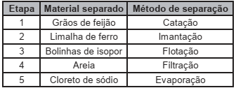 Para demonstrar os processos físicos de separação de componentes em misturas complexas, um professor de química apresentou para seus alunos uma mistura de limalha de ferro, areia, cloreto de sódio, bolinhas de isopor e grãos de feijão. Os componentes foram separados em etapas, na seguinte ordem: