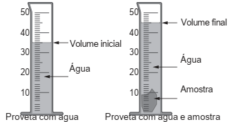 A densidade é uma propriedade que relaciona massa e volume de um material. Um estudante iniciou um procedimento de determinação da densidade de uma amostra sólida desconhecida. Primeiro ele determinou a massa da amostra, obtendo 27,8 g. Em seguida, utilizou uma proveta, graduada em mililitro, com água para determinar o volume da amostra, conforme esquematizado na figura. Considere a densidade da água igual a 1 g/mL.
