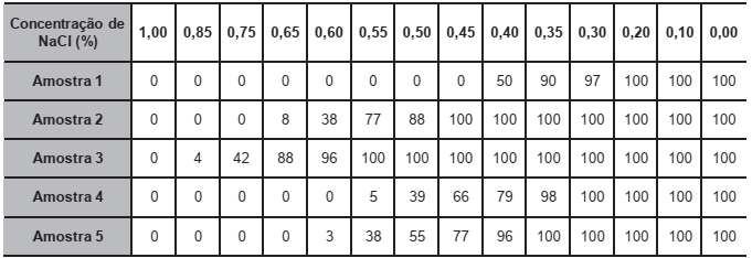 Em certas anemias hemolíticas, estão presentes no sangue circulante algumas hemácias esféricas (esferócitos), que se rompem mais facilmente que as hemácias normais em soluções hipotônicas. Essa fragilidade é proporcional ao número de esferócitos presentes. Em um laboratório, foi realizada a determinação da fragilidade osmótica de cinco amostras distintas. Os resultados obtidos estão representados na tabela, em percentual de hemólise.