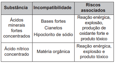 Os riscos apresentados pelos produtos dependem de suas propriedades e da reatividade quando em contato com outras substâncias. Para prevenir os riscos devido à natureza química dos produtos, devemos conhecer a lista de substâncias incompatíveis e de uso cotidiano em fábricas, hospitais e laboratórios, a fim de observar cuidados na estocagem, manipulação e descarte. O quadro elenca algumas dessas incompatibilidades, que podem levar à ocorrência de acidentes.