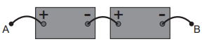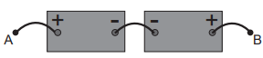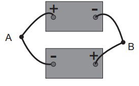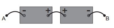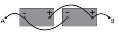 Apesar de incomum, é possível sofrer um acidente utilizando baterias de 12 V. Considere que um indivíduo com a pele molhada sofreu uma parada respiratória ao tocar simultaneamente nos pontos A e B de uma associação de duas dessas baterias.