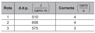 Como teste para o sistema, são utilizadas três possíveis vias para uma viagem de A até B, com os valores de d.d.p. e corrente conforme a tabela.