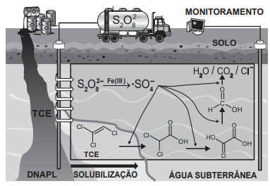 A figura ilustra de solos esquematicamente um processo de remediação de solos contaminados com tricloroeteno (TCE), um agente desengraxante. Em razão de vazamentos de tanques de estocagem ou de manejo inapropriado de resíduos industriais, ele se encontra presente em águas subterrâneas, nas quais forma uma fase líquida densa não aquosa (DNAPL) que se deposita no fundo do aquífero. Essa tecnologia de descontaminação emprega o Íon persulfato (S2O82-), que é convertido no radical •SO4- por minerais que contêm Fe(Ill). O esquema representa de forma simplificada o mecanismo de ação química sobre o TCE e a formação dos produtos de degradação.