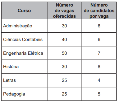 Uma instituição de ensino superior ofereceu vagas em um processo seletivo de acesso a seus cursos. Finalizadas as inscrições, foi divulgada a relação do número de candidatos por vaga em cada um dos cursos oferecidos. Esses dados são apresentados no quadro.