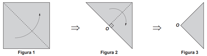 • Dobrar uma folha de papel em formato quadrado duas vezes, em sequência, ao longo das linhas tracejadas conforme ilustrado nas figuras 1 e 2, para obter o papel dobrado, conforme Figura 3.