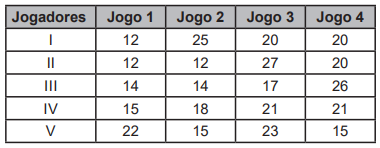 Nos cinco jogos finais da última temporada, com uma média de 18 pontos por jogo, um jogador foi eleito o melhor do campeonato de basquete. Na atual temporada, cinco jogadores têm a chance de igualar ou melhorar essa média. No quadro estão registradas as pontuações desses cinco jogadores nos quatro primeiros jogos das finais deste ano.