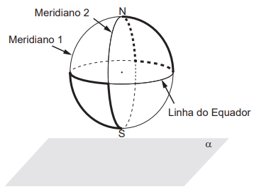 Na figura estão destacadas duas trajetórias sobre a superfície do globo terrestre, descritas ao se percorrer parte dos meridianos 1, 2 e da Linha do Equador, sendo que os meridianos 1 e 2 estão contidos em planos perpendiculares entre si. O plano α é paralelo ao que contém a Linha do Equador.