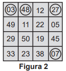 O jogo inicia e, nas quatro primeiras rodadas, foram sorteados os seguintes números: 03, 27, 07 e 48, Ao final da quarta rodada, somente Pedro possuía uma cartela que continha esses quatro números sorteados, sendo que todos os demais jogadores conseguiram assinalar, no máximo, um desses números em suas cartelas. Observe na Figura 2 o cartão de Pedro após as quatro primeiras rodadas.