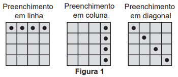 Em um jogo de bingo, as cartelas contêm 16 quadrículas dispostas em linhas e colunas. Cada quadrícula tem impresso um número, dentre os inteiros de 1 a 50, sem repetição de número. Na primeira rodada, um número é sorteado, aleatoriamente, dentre os 50 possíveis. Em todas as rodadas, o número sorteado é descartado e não participa dos sorteios das rodadas seguintes. Caso o jogador tenha em sua cartela o número sorteado, ele o assinala na cartela. Ganha o jogador que primeiro conseguir preencher quatro quadrículas que forma um linha, uma coluna ou uma diagonal, conforme os tipos de situações ilustradas na Figura 1.