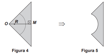 • Em seguida, no papel dobrado da Figura 3, considerar o ponto R, sobre o segmento OM, sendo M o ponto médio do lado do quadrado original, de modo que OR = 1/4 OM, traçar um arco de circunferência de raio medindo 1/2 OM com centro no ponto R, obtendo a Figura 4. Por último, recortar o papel ao longo do arco de circunferência e excluir a parte que contém o setor circular, obtendo o papel dobrado, conforme Figura 5.