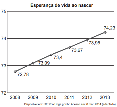 A esperança de vida ao nascer é o número médio de anos que um indivíduo tende a viver a partir de seu nascimento, considerando dados da população. No Brasil, esse número vem aumentando consideravelmente, como mostra o gráfico.