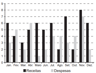 O gráfico apresenta os totais de receitas e despesas de uma empresa, expressos em milhão de reais, no decorrer dos meses de um determinado ano. A empresa obtém lucro quando a diferença entre receita e despesa é positiva e tem prejuízo quando essa diferença é negativa.