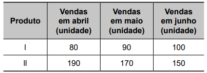 O gerente de uma fábrica pretende comparar a evolução das vendas de dois produtos similares (I e II). Para isso, passou a verificar o número de unidades vendidas de cada um desses produtos em cada mês. Os resultados dessa verificação, para os meses de abril a junho, são apresentados na tabela.