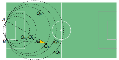 Num certo momento de um jogo digital, a tela apresenta a imagem representada na figura. O ponto Q1 representa a posição de um jogador que está com a bola, os pontos Q2, Q3, Q4 , Q5 e Q6 também indicam posições de jogadores da mesma equipe, e os pontos A e B indicam os dois pés da trave mais próxima deles. No momento da partida retratado, o jogador Q1 tem a posse da bola, que será passada para um dos outros jogadores das posições Qn, n ∈ {2, 3, 4, 5, 6}, cujo ângulo
