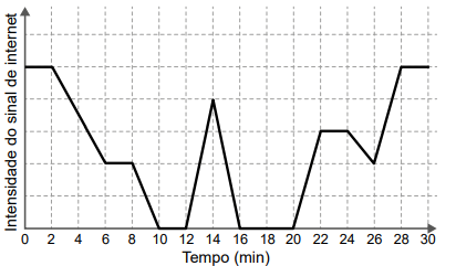 Uma pessoa caminha por 30 minutos e utiliza um aplicativo instalado em seu celular para monitorar a variação da intensidade do sinal de internet recebido pelo aparelho durante o deslocamento. Chegando ao seu destino, o aplicativo forneceu este gráfico: