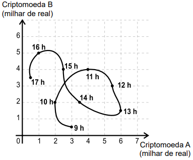 Um investidor iniciante observou o gráfico que apresenta a evolução dos valores de duas criptomoedas A e B em relação ao tempo.