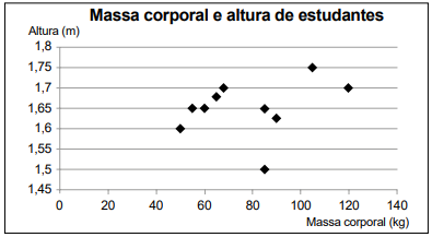 Um professor, para promover a aprendizagem dos estudantes em estatística, propôs uma atividade. O objetivo era verificar o percentual de estudantes com massa corporal abaixo da média e altura acima da média de um grupo de estudantes. Para isso, usando uma balança e uma fita métrica, avaliou uma amostra de dez estudantes, anotando as medidas observadas. O gráfico apresenta a massa corporal, em quilograma, e a altura, em metro, obtidas na atividade.