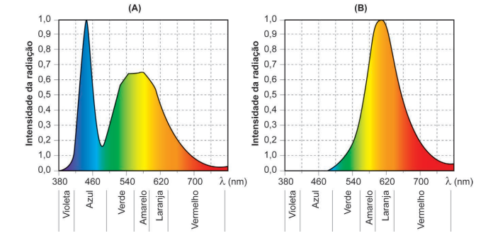 absorve a luz azul e emite luz amarelo-alaranjada.
