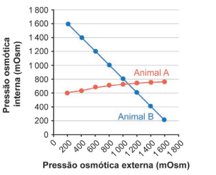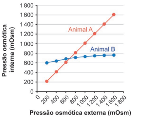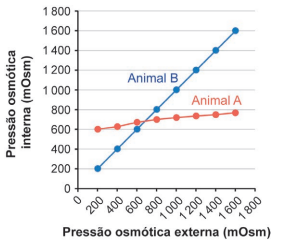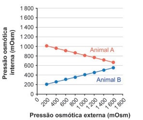 Um pesquisador coletou animais de duas espécies de invertebrados, sendo o Animal A um osmorregulador e o Animal B, um osmoconformador. Ambos foram submetidos, em laboratório, a ambientes aquáticos com diferentes osmolaridades. Em cada situação, foi medida a pressão osmótica interna tanto do Animal A como do Animal B.