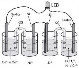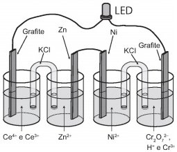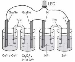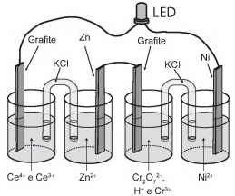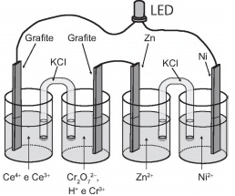 Qual associação em série de pilhas fornece diferença de potencial, nas condições-padrão, suficiente para acender o LED azul?