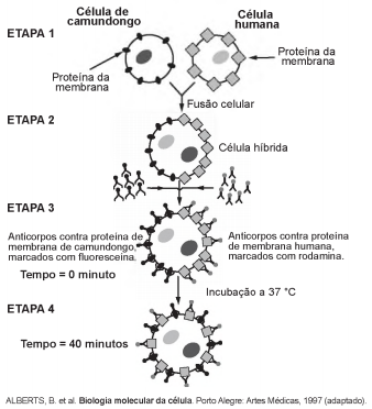Visando explicar uma das propriedades da membrana plasmática, fusionou-se uma célula de camundongo com uma célula humana, formando uma célula híbrida. Em seguida, com o intuito de marcar as proteínas de membrana, dois anticorpos foram inseridos no experimento, um específico para as proteínas de membrana do camundongo e outro para as proteínas de membrana humana. Os anticorpos foram visualizados ao microscópio por meio de fluorescência de cores diferentes.