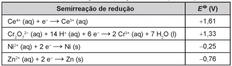 A invenção do LED azul, que permite a geração de outras cores para compor a luz branca, permitiu a construção de lâmpadas energeticamente mais eficientes e mais duráveis do que as incandescentes e fluorescentes. Em um experimento de laboratório, pretende-se associar duas pilhas em série para acender um LED azul que requer 3,6 volts para o seu funcionamento. Considere as semirreações de redução e seus respectivos potenciais mostrados no quadro.